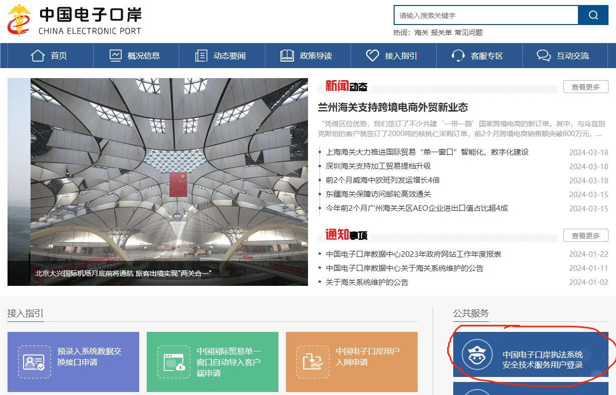 打开“中国电子口岸”官网,点击“中国电子口岸执法系统安全技术服务用户登录”。