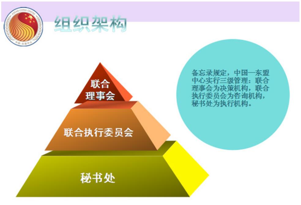 中国一东盟中心实行三级管理:联合理事会为决策机构,联合执行委员会为咨询机构,秘书处为执行机构。其中秘书处下设四个部门,分别是综合协调部、贸易投资部、教育文化旅游部和新闻公关部。