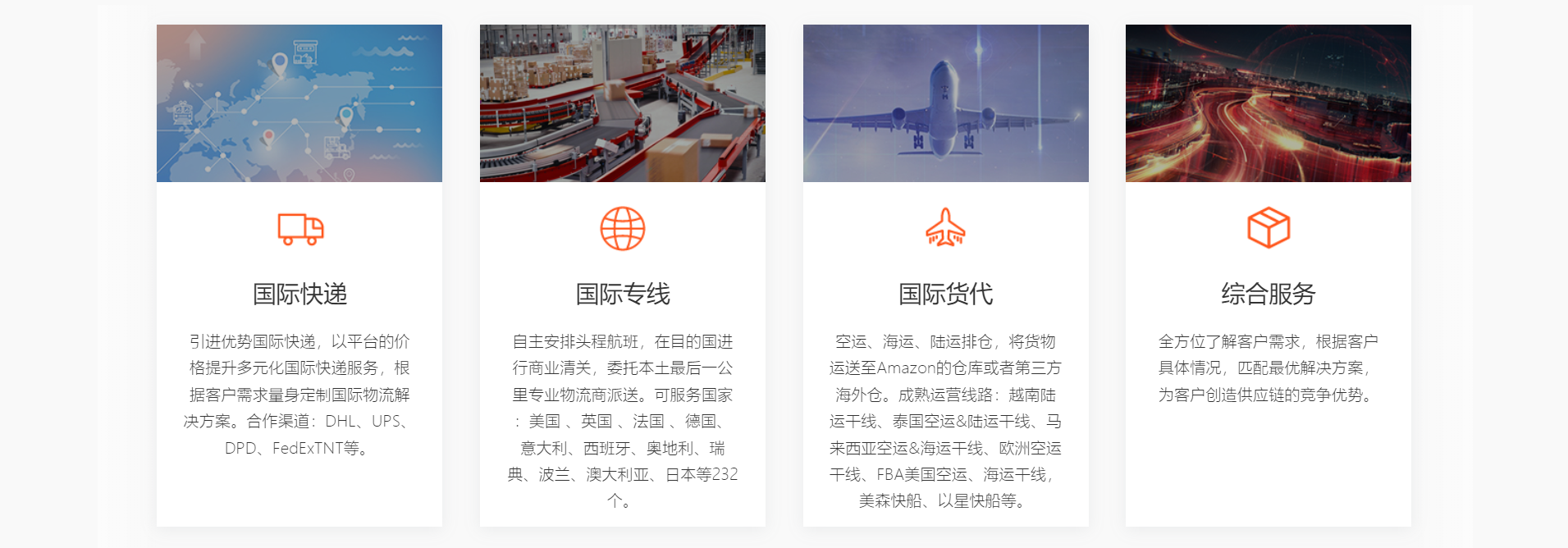 悦希物流以多元化的国际物流服务为特色,涵盖国际快递、国际专线和货代服务等。通过引入国际快递合作渠道如 DHL、UPS、DPD、FedEx 等,以平台价格提供优质服务,同时针对客户需求量身定制国际物流方案。其国际专线拥有自主安排的头程航班及商业清关服务,覆盖 232 个国家,以及成熟的运营线路,如越南、泰国、马来西亚、欧洲等。除此之外,悦希物流还提供全方位综合服务,全面了解客户需求,为其量身打造最优的供应链解决方案,助力客户获取竞争优势。