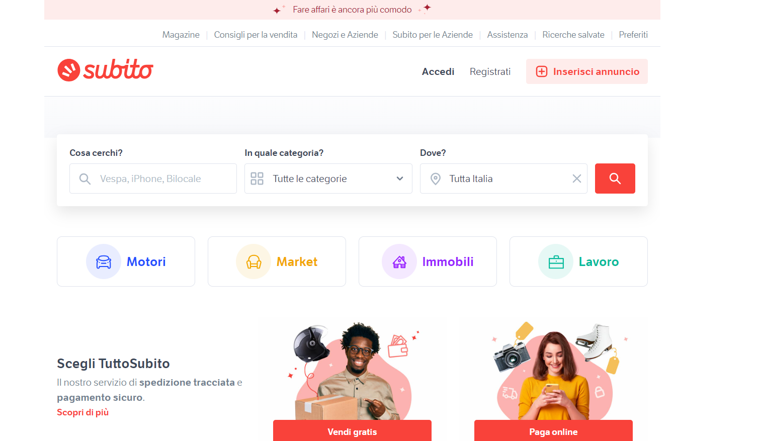 Subito.it的目标一直是在意大利提供最简单,最快和最安全的在线销售服务。因此,初体验的人和专业用户每天都会选择立即进行良好的业务。