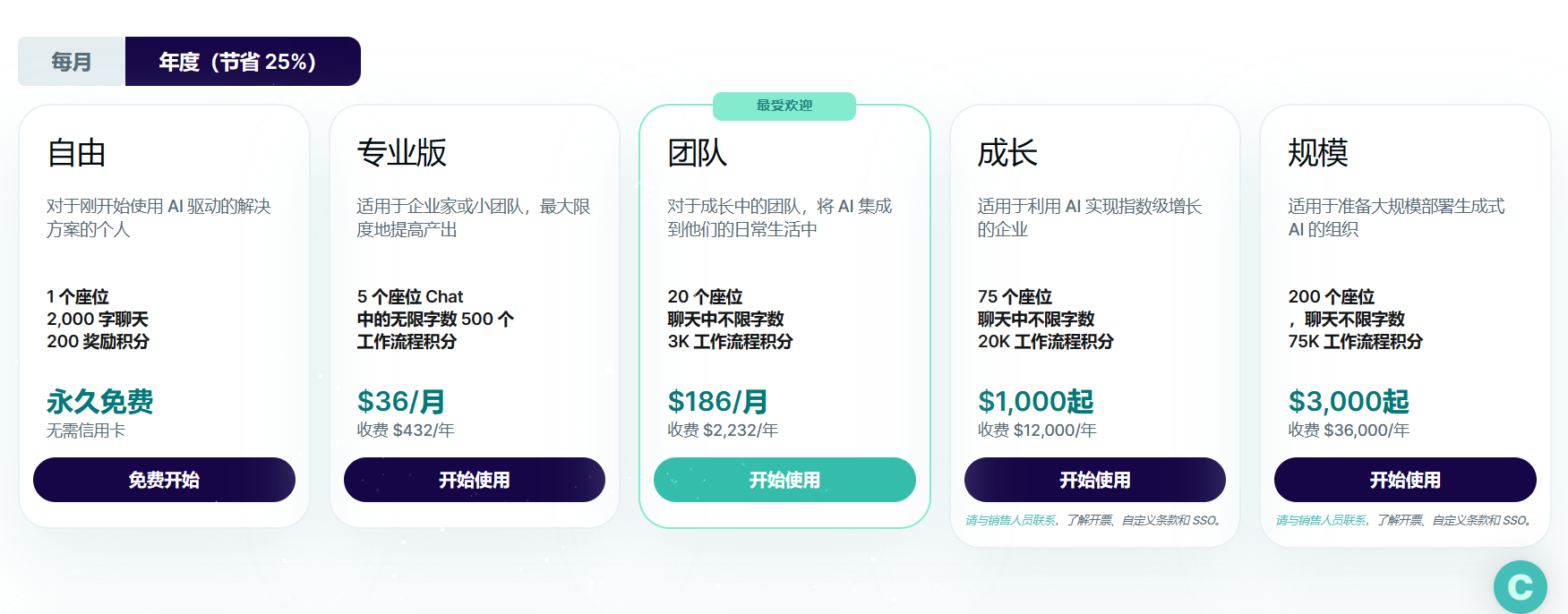 已经能满足入门的大多数功能,您可以在体验后选择是否升级,对于刚开始使用 AI 驱动的解决方案的个人,免费版包括: