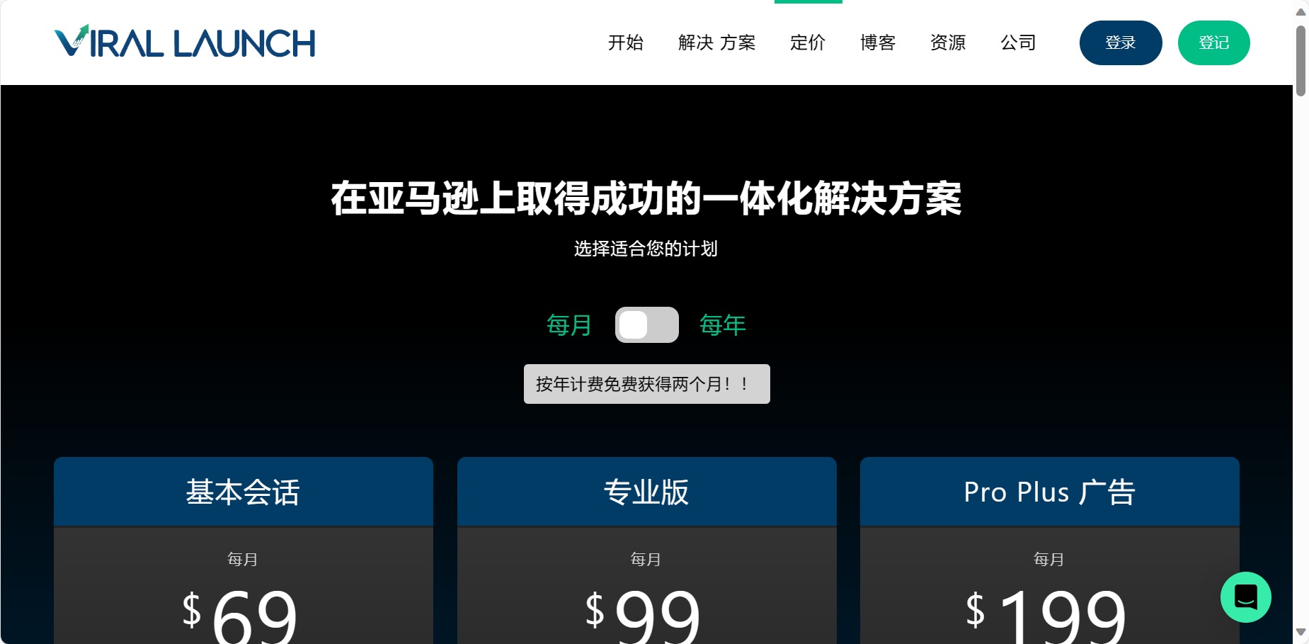 Viral Launch的付费模式分为年付和月付两种模式,每种模式下分为三种不同的套餐,套餐内容根据价格的不同有所变化,使用者可根据个人需求购买相应的套餐,年付较月付便宜,且按年支付免费赠送两个月,集体价格和套餐内容可跳转至官网查看
