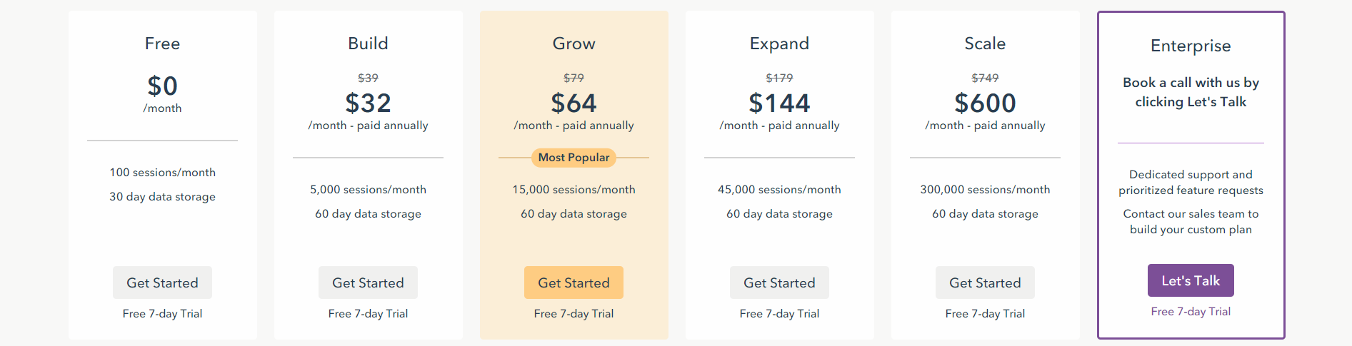 Lucky Orange 提供多种价格方案,以满足不同需求,从免费套餐到企业级解决方案。月付的免费计划提供基本功能,包括每月 100 个会话和 30 天的数据存储限制。随着规模扩大,付费计划如 Build、Grow、Expand 和 Scale 提供更多会话、更长的数据存储时间以及高级功能,满足不同流量量的企业需求。企业级方案提供专属支持和定制功能,需要与销售团队直接对话,以创建个性化的套餐。所有方案均包含 7 天免费试用,让用户在决定前体验平台。此外,选择年度计费可在各个方案中节省高达 20% 的费用。