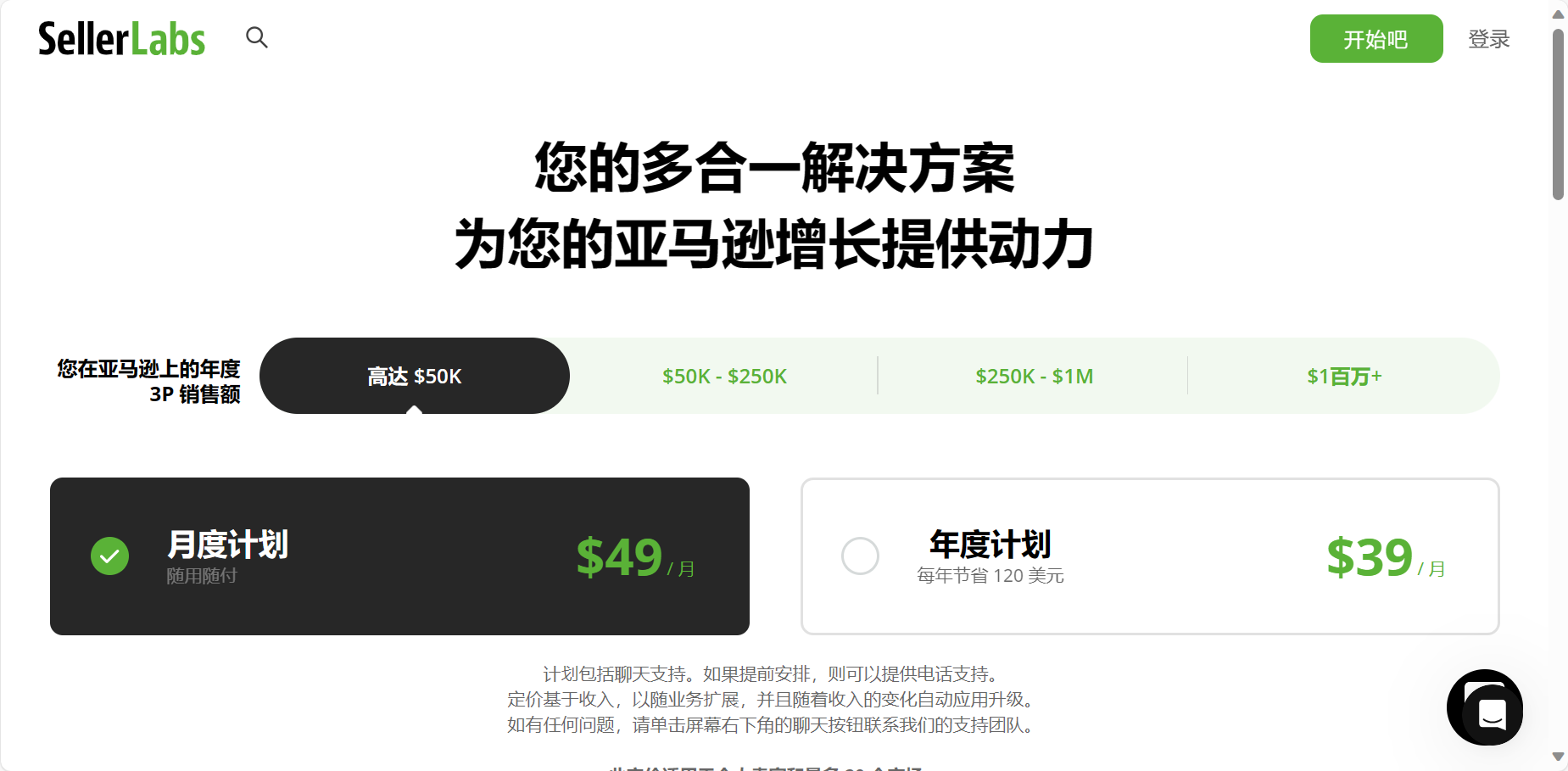 Seller Labs的付费模式分为月付和年付两种模式,根据您的店铺的销售额区间有四种不同的套餐,具体可跳转至官网查看跳转