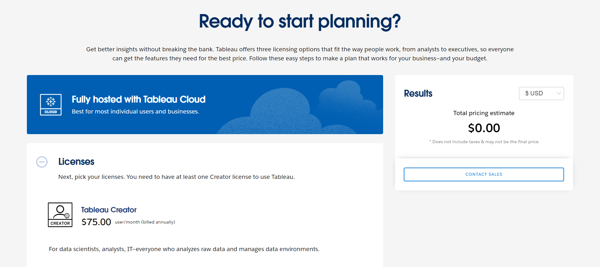 Tableau 提供了灵活而经济实惠的定价结构,满足不同用户角色和业务需求。从 Creator、Explorer 到 Viewer 的不同许可证选项,Tableau 确保数据科学家、分析师、IT 专业人员、业务用户以及任何利用数据洞察的人都可以以合理的价格访问所需的功能。全托管的 Tableau Cloud 选项非常适合个人用户和企业,提供无缝的体验。基于所选许可证和附加组件计算的定价估算允许企业有效规划预算,实现更好的洞察力而不牺牲价值。