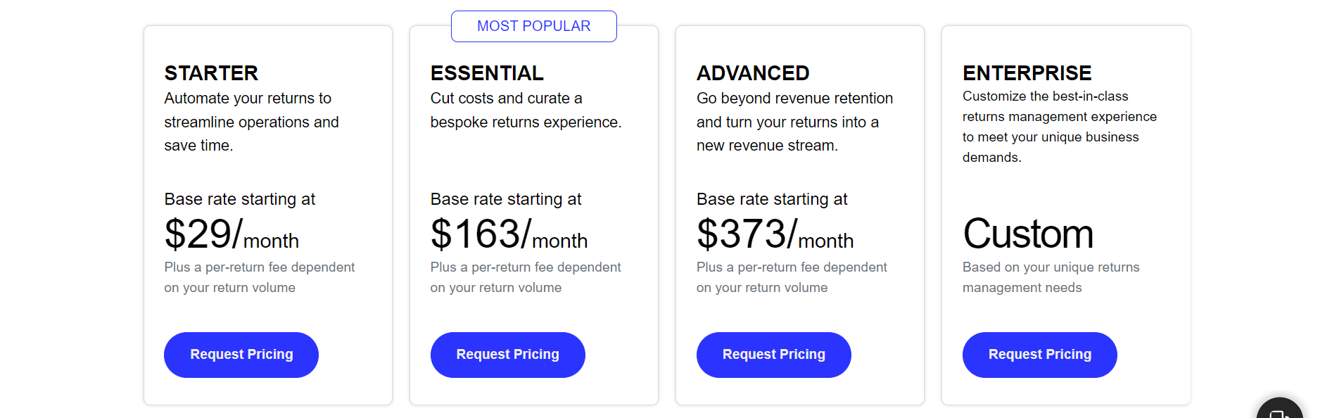 Loop Returns 提供多样化的定价计划,以满足不同用户的需求。用户可以根据其具体的退货管理需求选择适合的定价计划。Loop 的定价计划采用基于使用量的灵活模式,用户只需支付较低的基础费用,然后根据实际的退货数量支付额外的退货费用。从 Starter 计划到 Enterprise 计划,Loop Returns 覆盖了各种业务规模和需求,使用户能够以适合其业务增长的价格体验一流的退货管理服务。