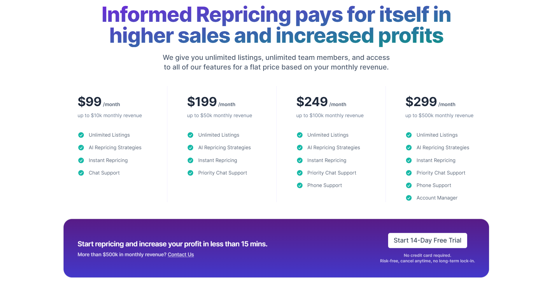 Informed Repricing 通过透明而可扩展的定价结构,确保卖家可以选择适合其业务月度收入的计划。从每月 99 美元的计划开始,适用于月销售额不超过 10,000 美元的企业,用户可以获得无限的列表,人工智能定价策略,即时调价和响应迅速的聊天支持。随着业务的增长,用户可以无缝升级到每月 199 美元的计划,适用于月销售额不超过 50,000 美元的企业,其中包括优先聊天支持。定价层继续为不断发展的企业提供服务,为每月销售额最高达 500,000 美元的企业提供每月 299 美元的计划,其中包括电话支持和专属客户经理。Informed Repricing 还提供为期 14 天的免费试用,无需信用卡,确保用户在承诺之前体验其好处,并具有随时取消而无需长期锁定的灵活性。
