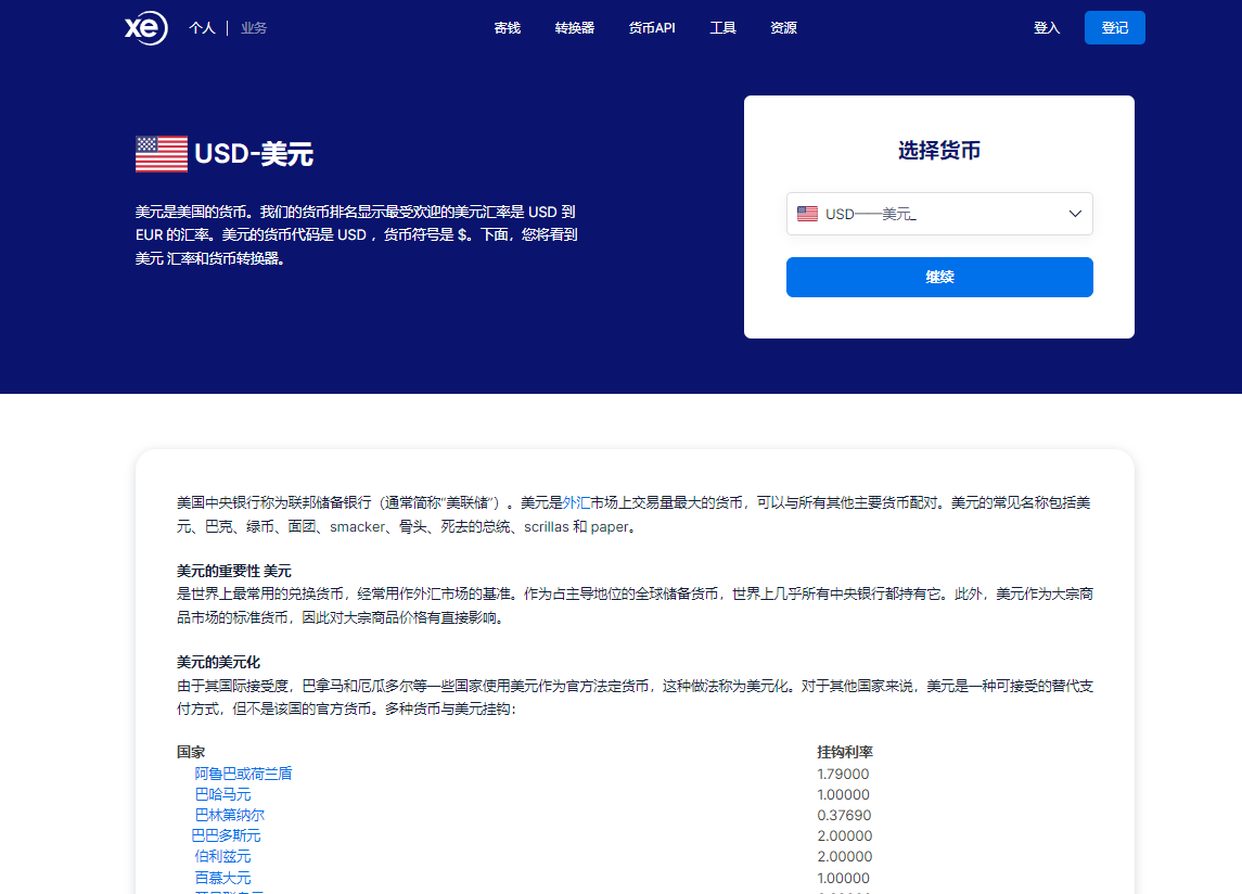 对于不熟悉的货币,XE.com还提供了专业的货币信息介绍。如USD-美元介绍