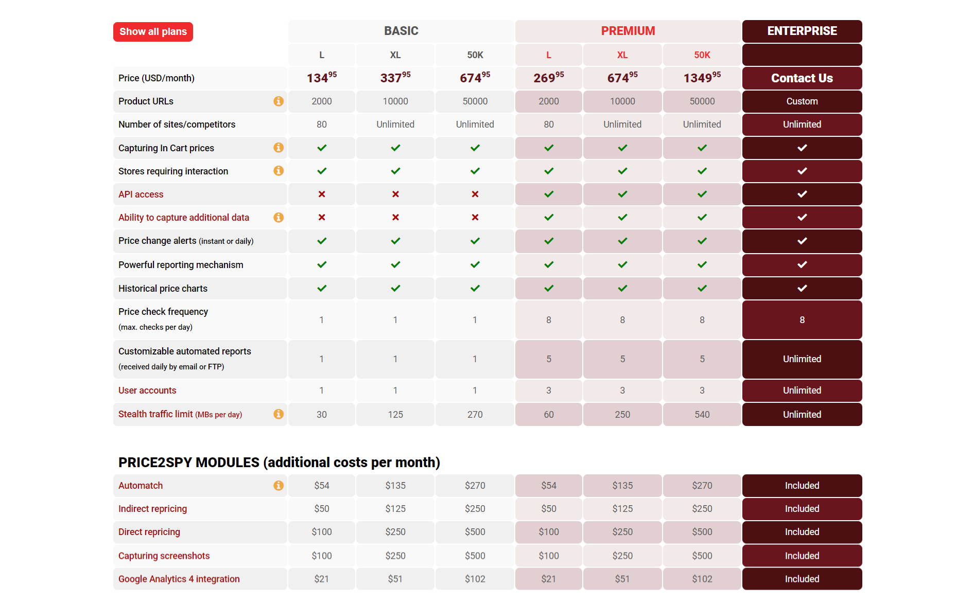 Price2 Spy 提供了多个灵活的定价计划,以满足不同规模和需求的用户。基本价格计划分为 Small、Medium、Large、XL 和 50 K 等多个档次,覆盖了从 100 个产品 URL 到 50000 个产品 URL 的不同需求。每个计划都包含强大的实时或每日价格变动警报、多样化的报告机制等功能,用户可以根据其业务规模和监测需求选择合适的计划。此外,对于需要超过 50 K 产品 URL 的用户,Price2 Spy 还提供定制报价的服务。对于追求更高级功能和服务的用户,Premium 价格计划则提供了更频繁的价格检查、即时价格变动警报等增值服务。对于大型企业,Price2 Spy 推出了 Enterprise 套餐,为用户提供了无忧的企业级解决方案,将数据收集工作交给 Price2 Spy,使企业能够专注于利用定价数据做出智能决策。