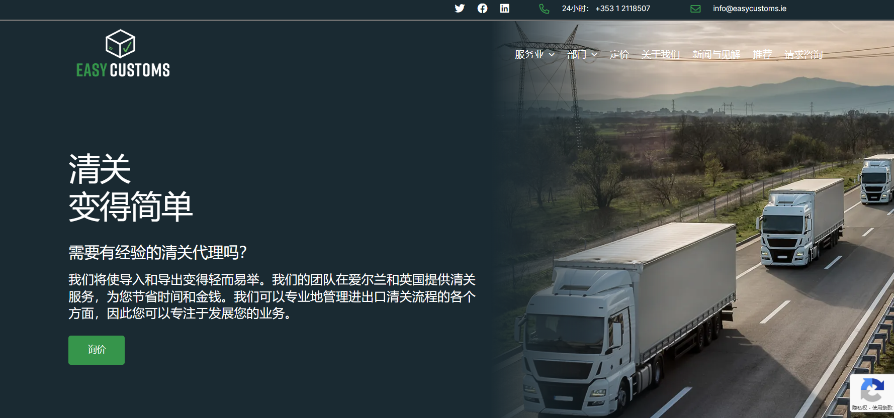 Easy Customs 是一家领先的独立清关机构,致力于为客户(运输商、进口商和出口商)提供尽可能轻松、轻松的清关流程,并为企业客户和个人消除脱欧后贸易的挑战。EasyCustoms将使导入和导出变得轻而易举。团队提供爱尔兰和英国的清关服务,为您节省时间和金钱。可以专业管理进出口清关流程的各个方面,以便您可以专注于发展您的业务。