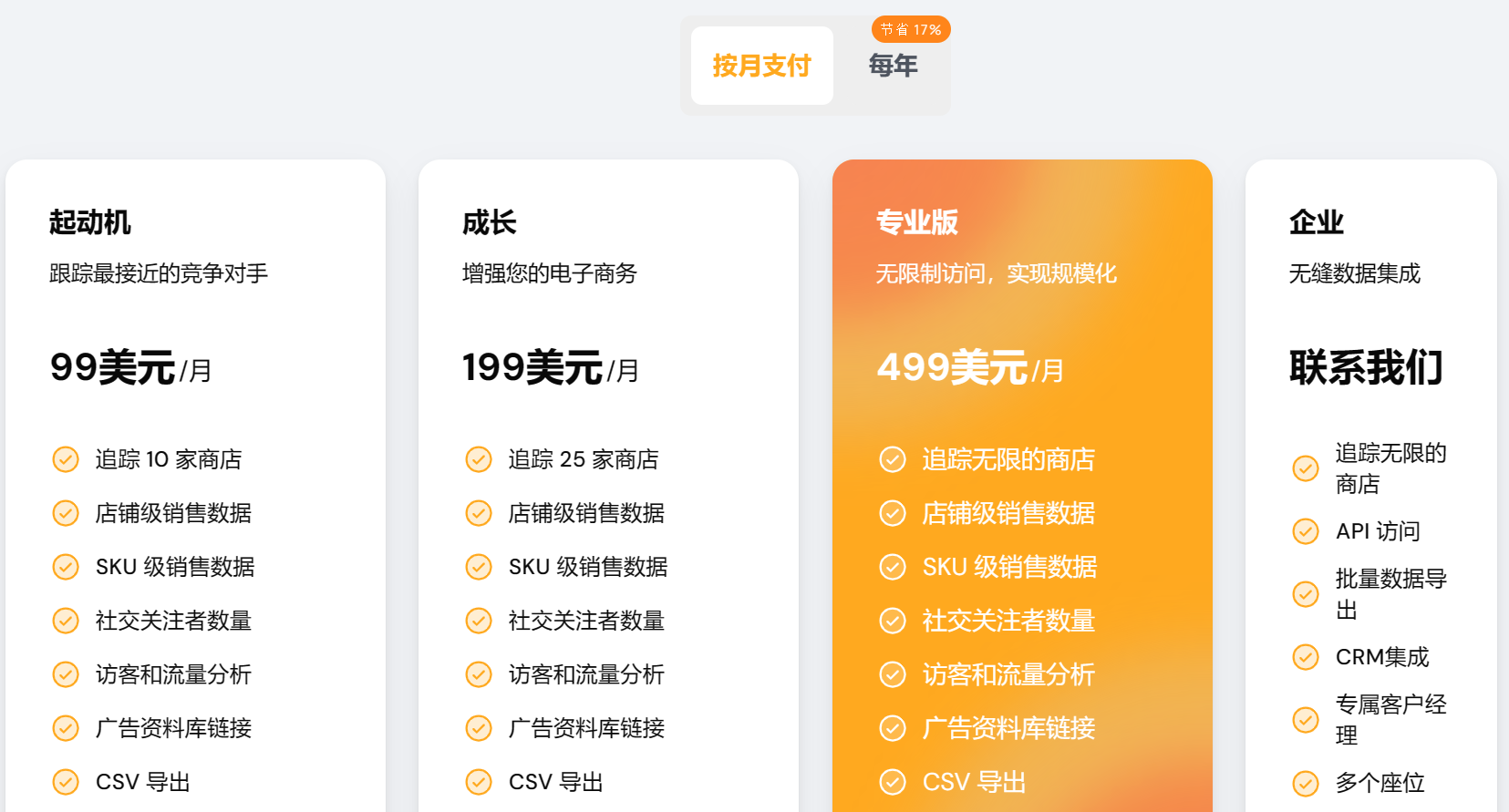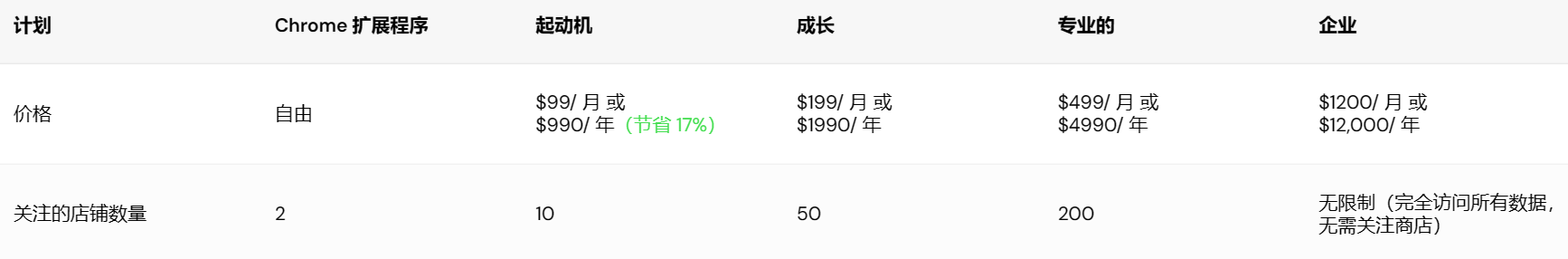 Commerce Inspector的拓展程序提供免费试用,但只可以关注两个店铺,需要更多的指标需要升级为更高的套餐