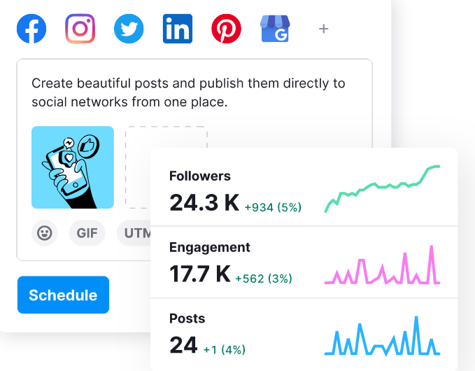 在社交媒体上排期和发布内容,分析帖子的效果,跟踪和分析竞争对手账户,管理您的公众品牌声誉