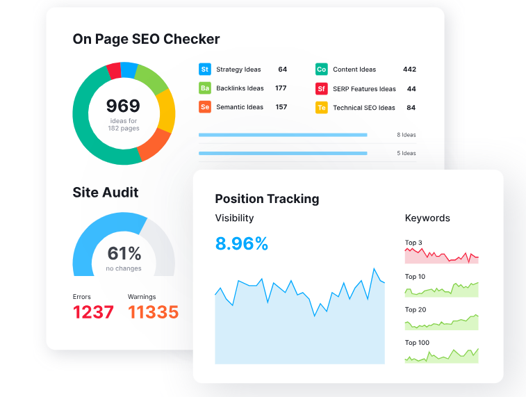发现当地和全国数百万个关键词,分析任何域名的反向链接整体情况,运行 SEO 技术检测每天跟踪您的SERP排名