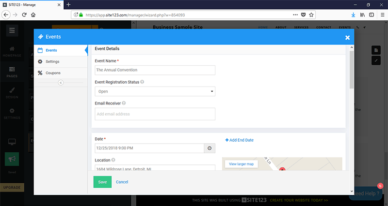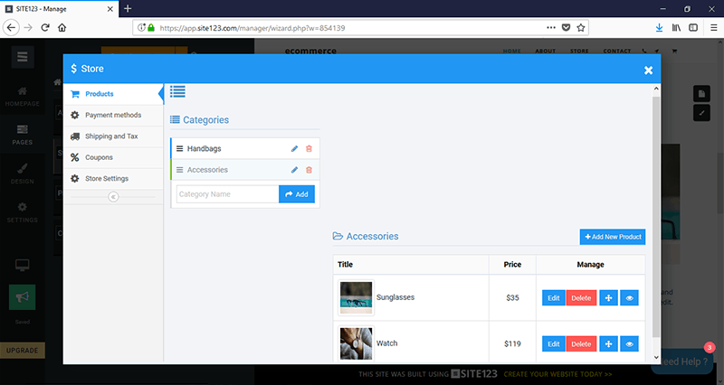 其电子商务部分很容易设置。 你可以将产品分类并指示SITE123如何计算销售税和运费。 如果你想收到订单付款,你需要一个额外的方案来与信用卡提供商如PayPal和Stripe整合。
