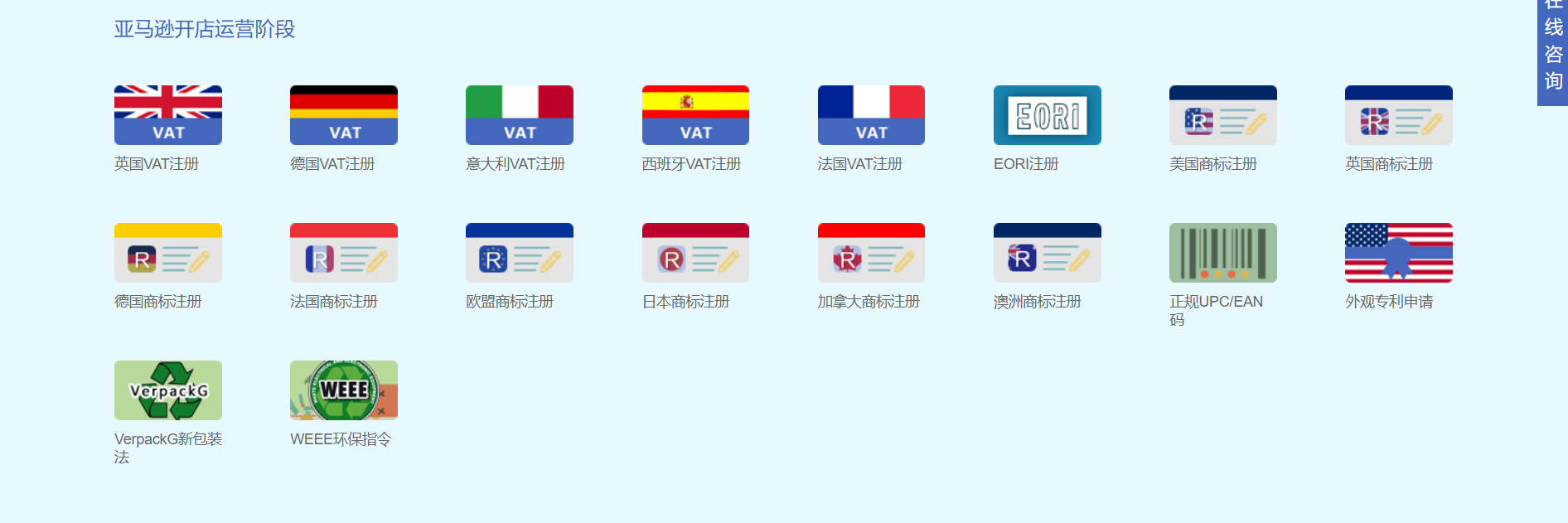 开店准备阶段服务:公司注册、商标注册、VAT 注册等一系列准备工作,包括商标周边和外观设计专利等。