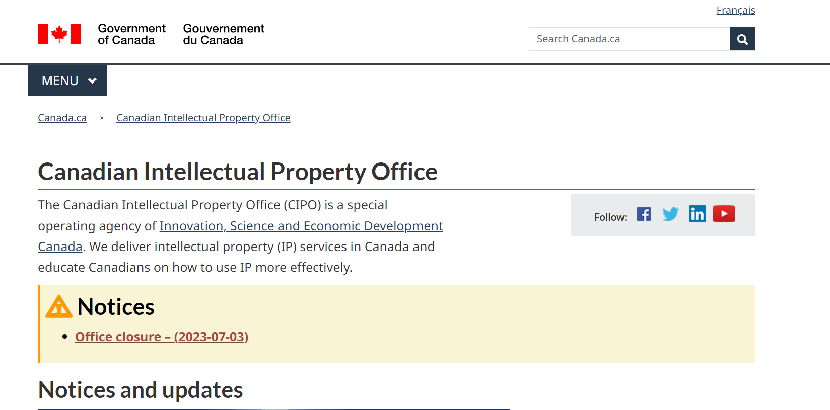 加拿大商标局(Canadian Intellectual Property Office,简称CIPO)是加拿大的官方机构,负责管理和保护加拿大的商标、专利、版权和工业设计等知识产权(IP)事务,也是加拿大创新、科学和经济发展部的专门运营机构。