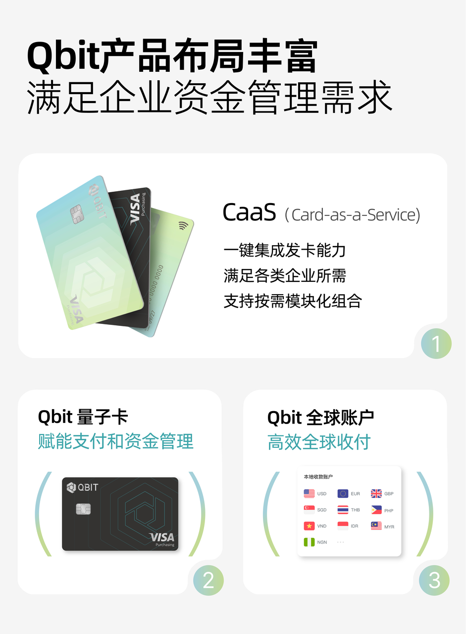 Qbit,创立于2019年,是一家为全球企业提供一站式海外资金管理的Neobank(创新数字银行),旗下有全球收单、全球账户、量子卡、BaaS、CaaS等核心产品。通过搭建数字化的跨境支付和金融基础设施,帮助企业实现更高时效、更低成本的全球收付、企业发卡和财务管理,轻松实现全球业务扩展与增长。