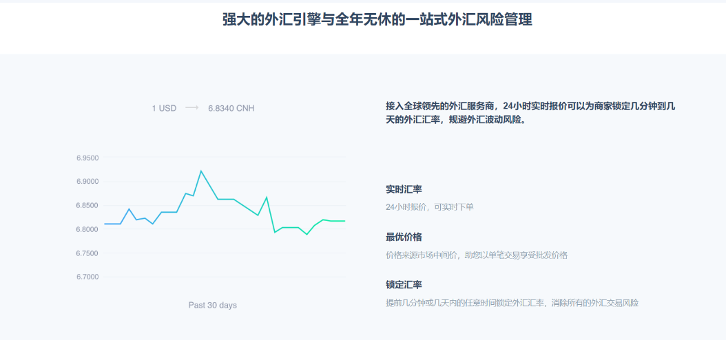 接入全球领先的外汇服务商,24小时实时报价可以为商家锁定几分钟到几天的外汇汇率,规避外汇波动风险。