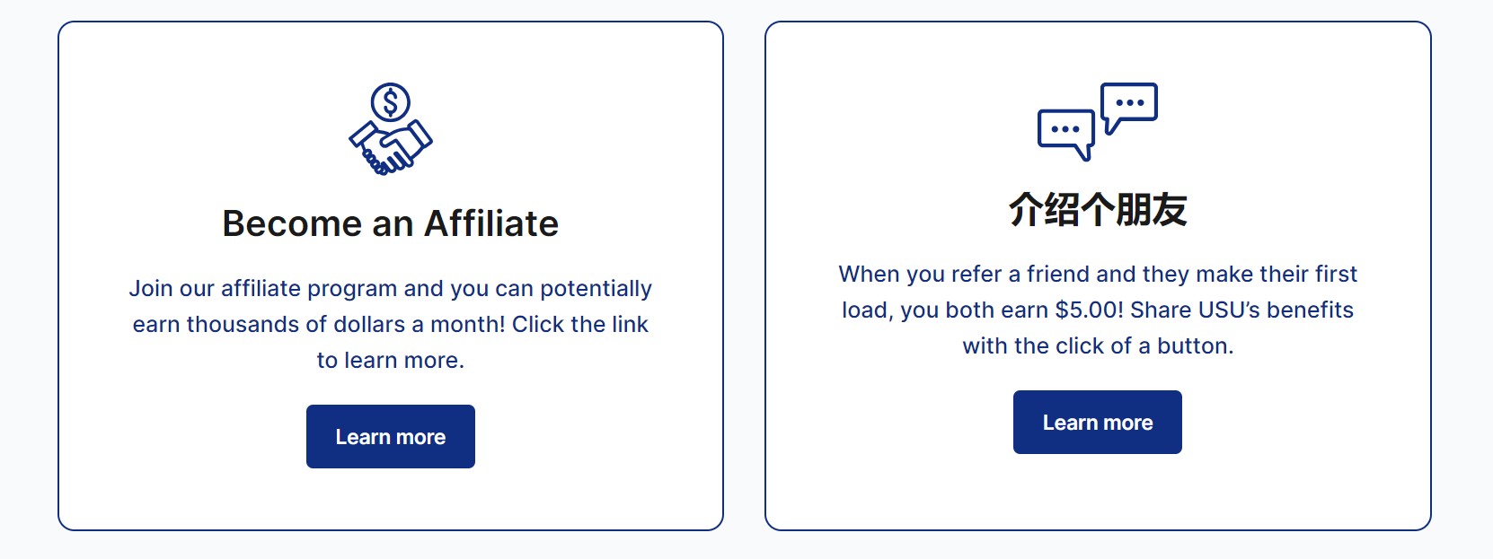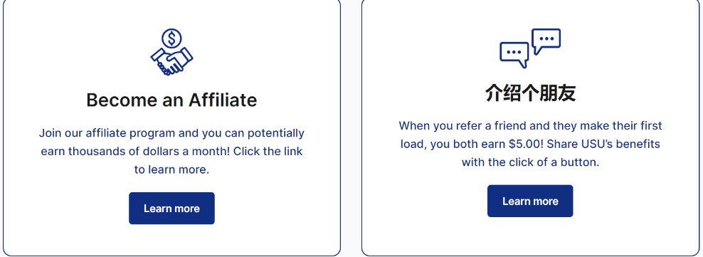 当您推荐朋友并且他们完成首次加载时,你们双方均可赚取 5.00 美元!只需单击按钮即可分享 USU 的优势。