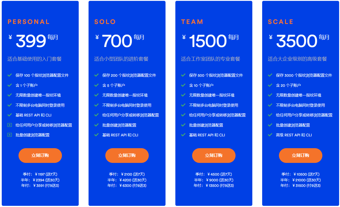 VMlogin设置了多档定价,分为免费版、个人版、团队版、组织版、企业版