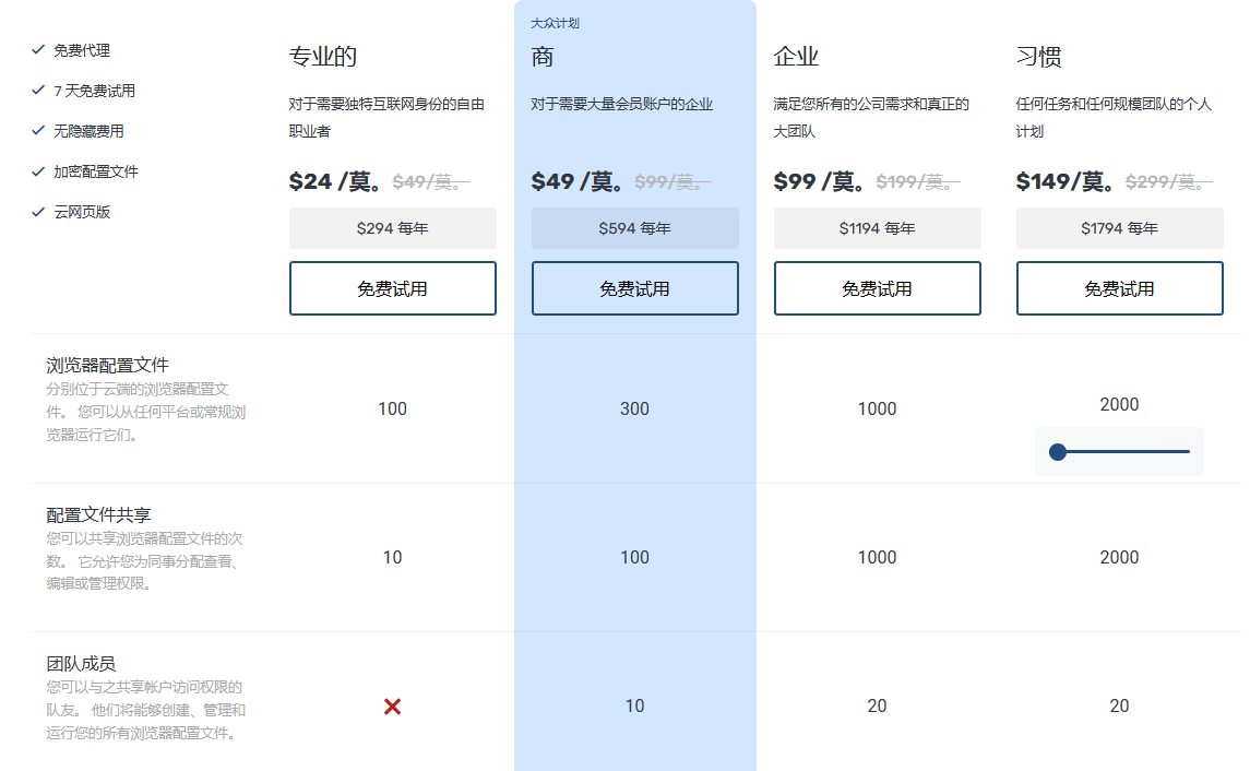 GoLogin设置了多档定价,分为专业版、商业版、企业版