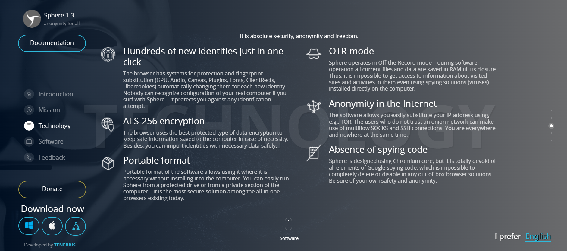 Sphere 在 Off-the-Record 模式下运行 – 在软件运行期间,所有当前文件和数据都保存在 RAM 中直至关闭。因此,即使使用直接安装在计算机上的间谍解决方案(病毒),也无法访问有关所访问站点及其活动的信息。
