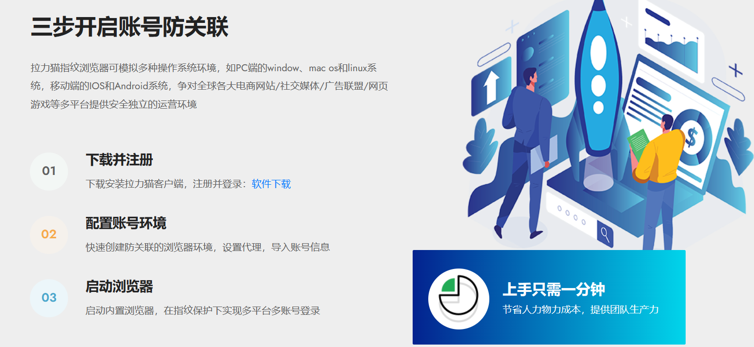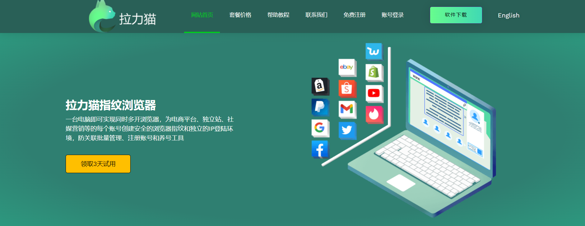 拉力猫指纹浏览器,一台电脑即可实现同时多开浏览器,为电商平台、独立站、社媒营销等的每个账号创建安全的浏览器指纹和独立的IP登陆环境,防关联批量管理、注册账号和养号工具。