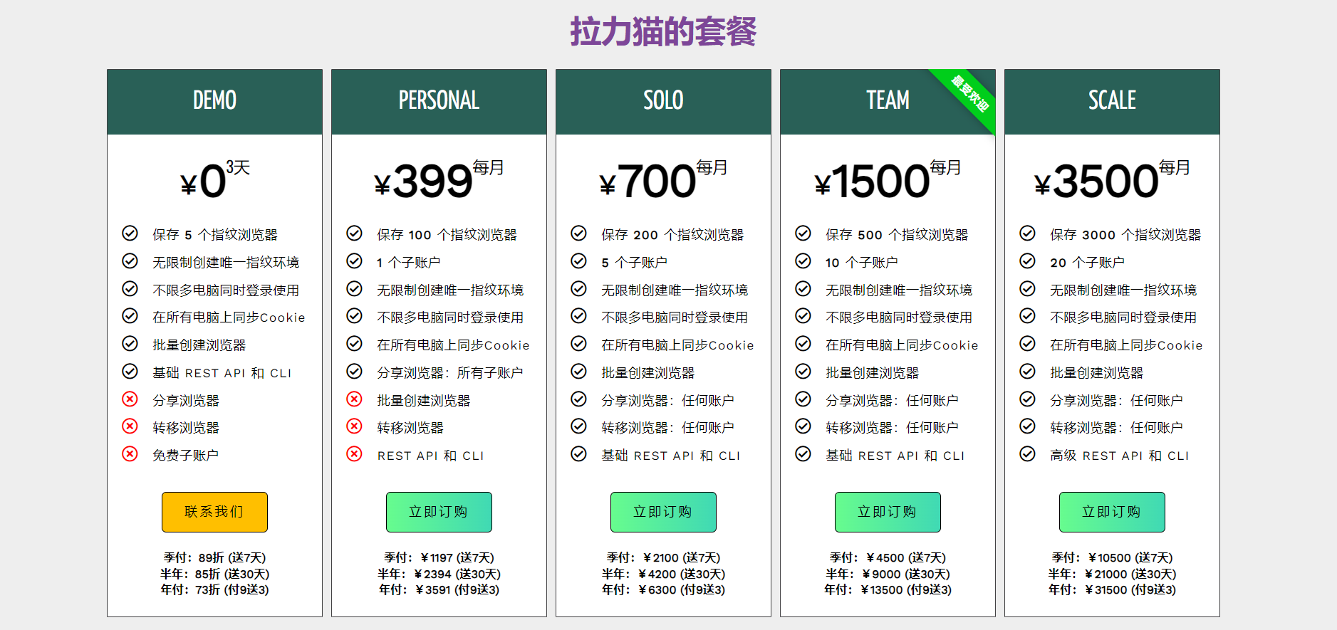 拉力猫设置了多档定价,分为免费版、入门版、进阶版、专业版、企业版。