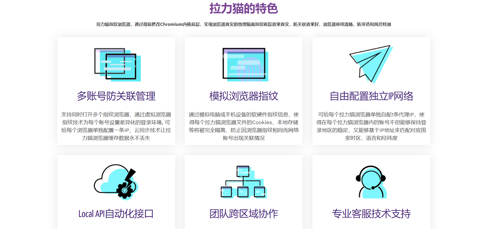 致力于为用户提供最高等级的隐私安全保障,让全球更多用户享受安全浏览网络服务依托自主知识产权的拉力猫指纹浏览器平台形成完善的产品及服务体系。