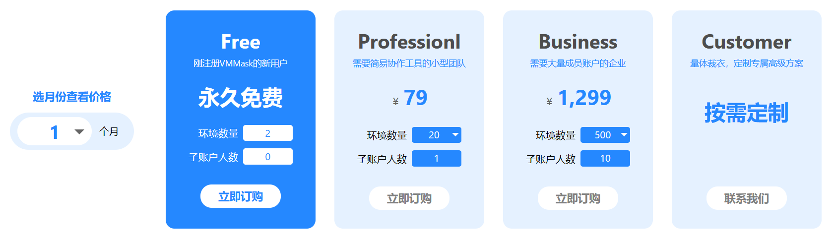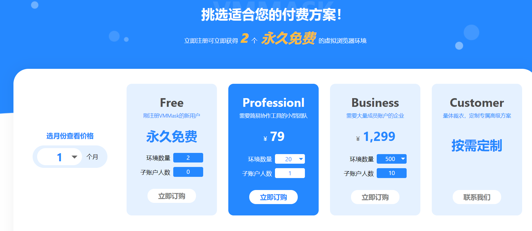 VMMask设置了多档定价,分为免费版、团队版、企业版和商业版。注册即可获得2个永久免费的虚拟浏览器环境。