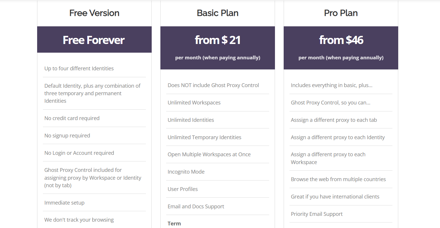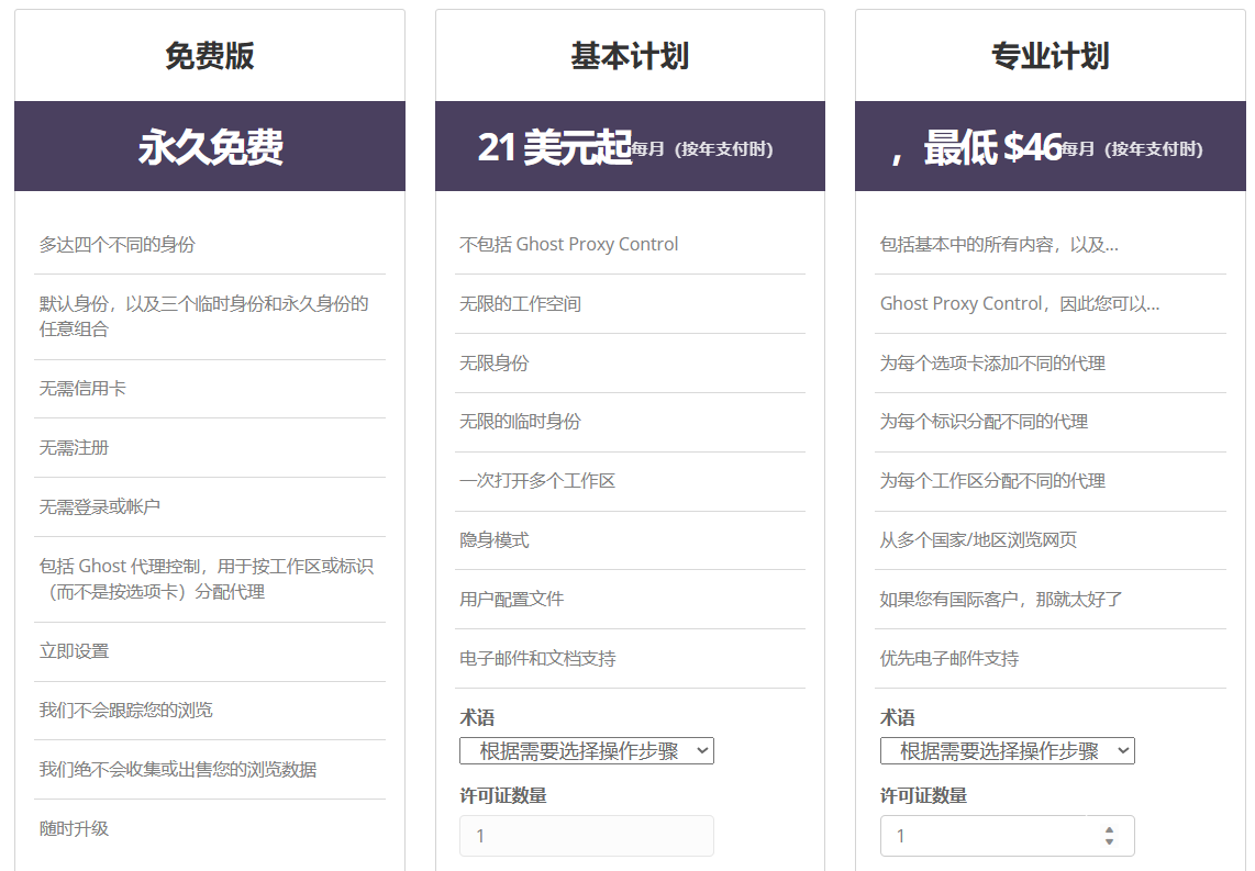 Ghost Browser设置了多档定价,分为免费版、基本计划和专业计划。