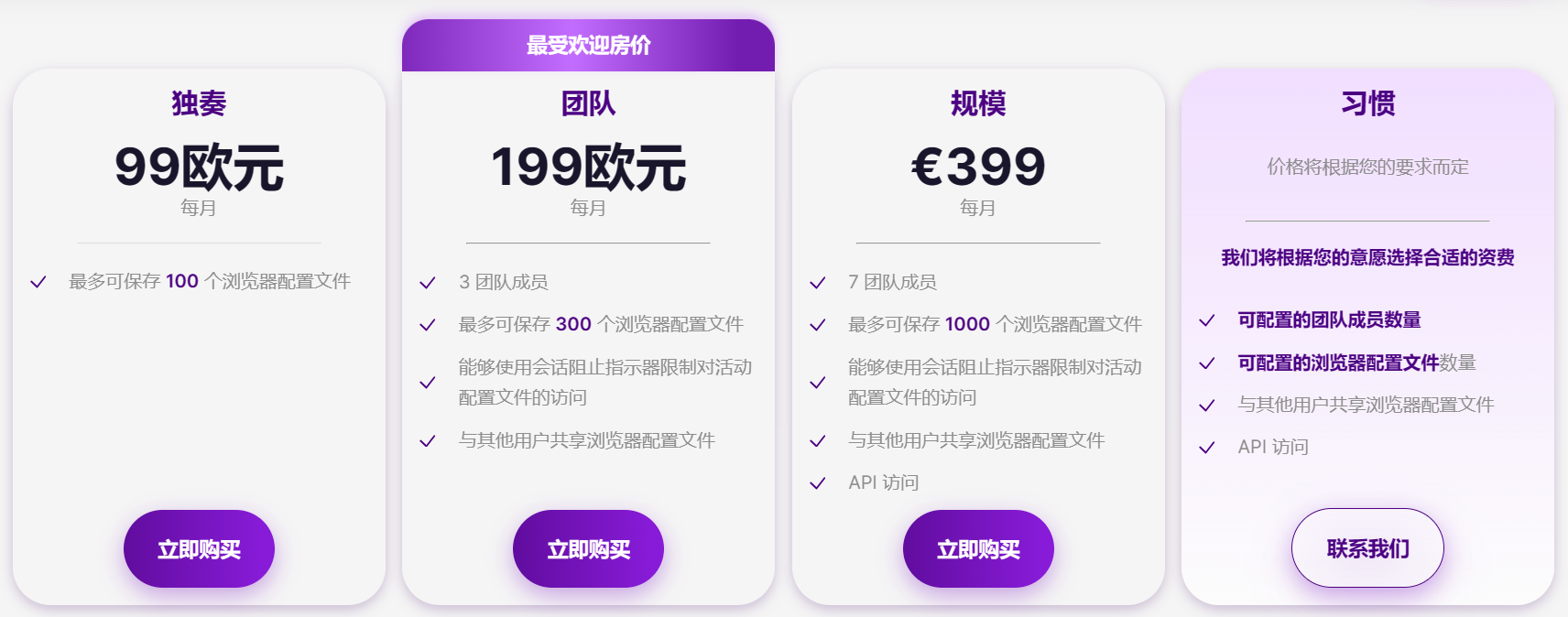 Indigo Browser设置了多档定价,分为个人版、团队版、企业版和定制版。