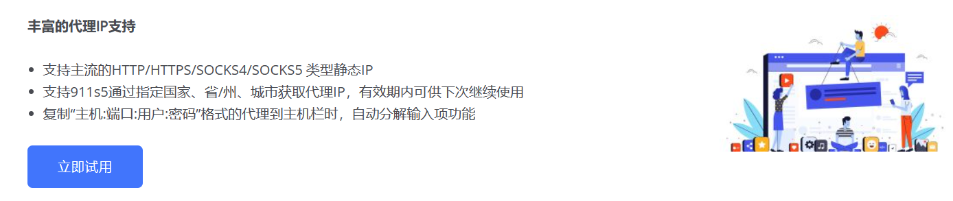 支持主流的HTTP/HTTPS/SOCKS4/SOCKS5 类型静态IP,支持911s5通过指定国家、省/州、城市获取代理IP,有效期内可供下次继续使用。复制“主机:端口:用户:密码”格式的代理到主机栏时,自动分解输入项功能。