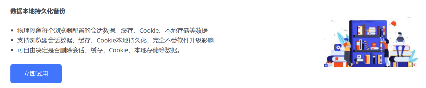 物理隔离每个浏览器配置的会话数据、缓存、Cookie、本地存储等数据,支持浏览器会话数据、缓存、Cookie本地持久化,完全不受软件升级影响,可自由决定是否删除会话、缓存、Cookie、本地存储等数据。