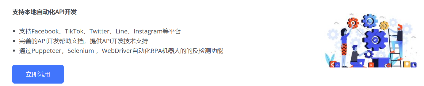 支持Facebook、TikTok、Twitter、Line、Instagram等平台。完善的API开发帮助文档,提供API开发技术支持。通过Puppeteer,Selenium ,WebDriver自动化RPA机器人的的反检测功能。