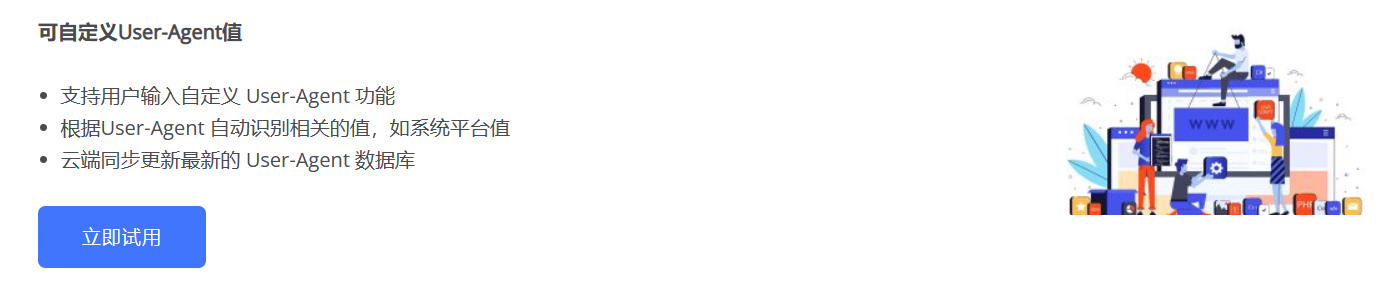 支持用户输入自定义 User-Agent 功能,根据User-Agent 自动识别相关的值,如系统平台值。云端同步更新最新的 User-Agent 数据库。