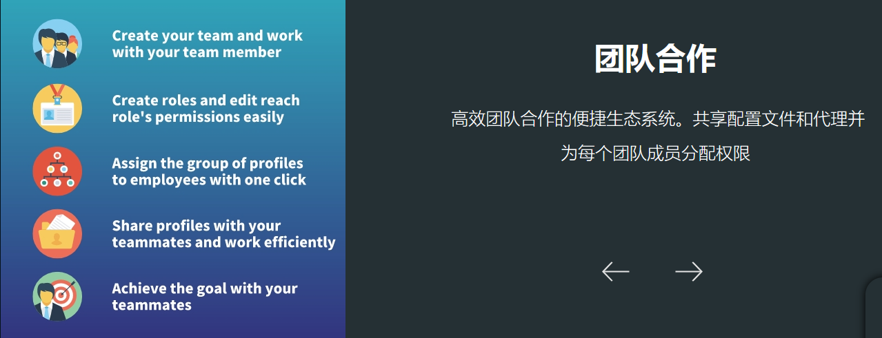高效团队合作的便捷生态系统。共享配置文件和代理并为每个团队成员分配权限