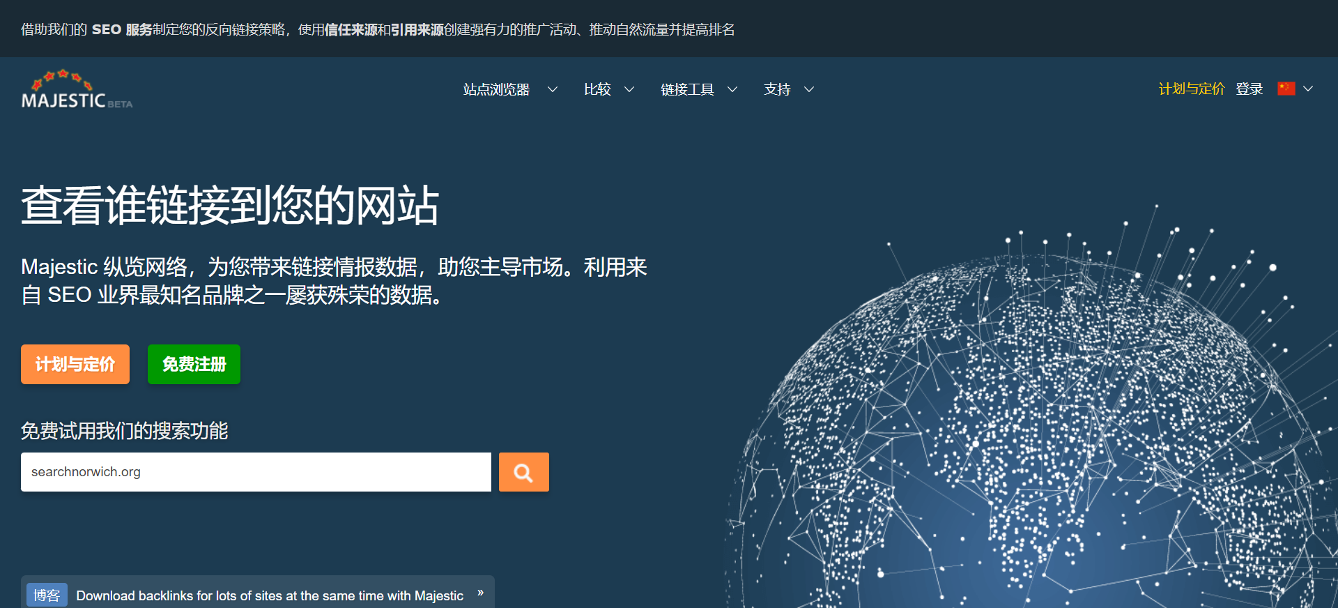 使用 Majestic 可以获得完整的网络链接调查结果和强大的链接情报工具。其站点浏览器工具能够找到顶尖网站,计划功能可以追踪您最喜欢的网站,Link Context 工具则提供了全新的反向链接审查方式。
