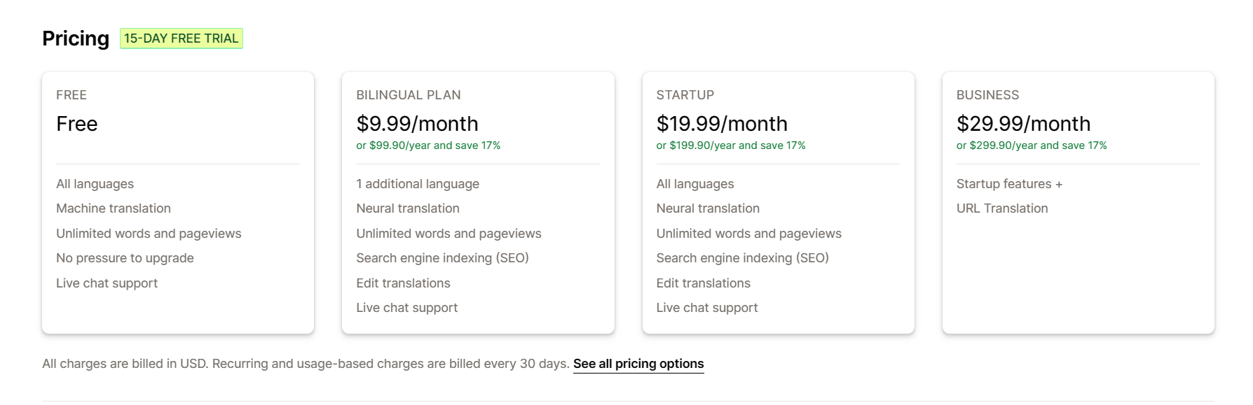 目前给出四种不同的定价方案,分别为免费版、双语版、基础版、商业版;其中免费版只支持15天的免费使用,解锁基础功能可满足大部分需求;如果只需要一种语言翻译可以选择双语版,除语言翻译外和基础版功能相同。基础款支持所有语言翻译、无限的字数和浏览量、搜索引擎索引 (SEO)、编辑翻译、实时聊天支持;商业版在基础版的基础上新增URL翻译。用户可根据自身需求选择合适定价方案。