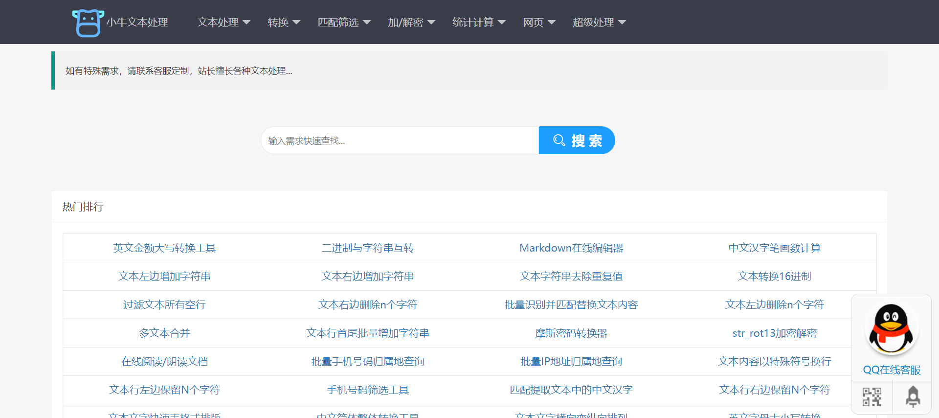 小牛文本处理网是一个强大的在线文本处理平台,提供多种实用工具和服务,涵盖文本转换、匹配筛选、加解密、统计计算、网页处理等多个领域。