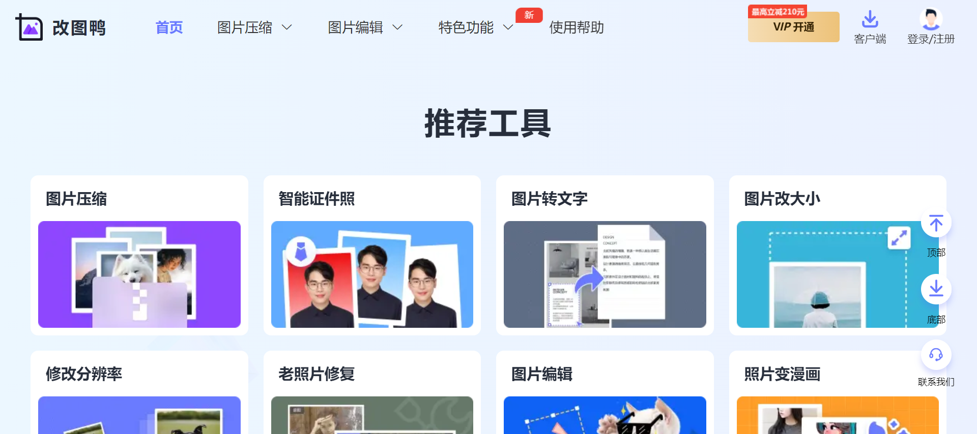 改图鸭提供了广泛的图片处理功能,包括但不限于图片压缩、编辑、格式转换、修复等。用户可以根据需要对图片进行大小调整、裁剪、加水印,甚至是进行高级的老照片修复、人脸模糊修复,以及将照片变成漫画等创意操作。