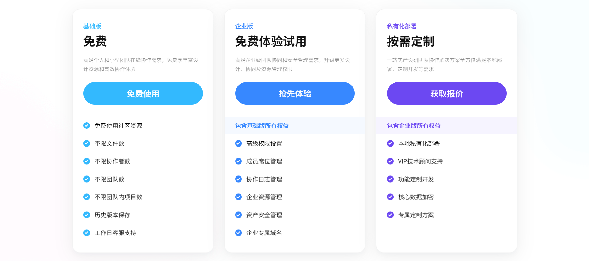 Pixso 会员服务提供灵活的使用选择,从免费的基础版满足个人及小型团队在线协作需求,享受丰富设计资源和高效协作体验,到企业版,拥有更多高级权限设置、协作日志管理、企业资源管理等特权,满足企业级团队协同和安全管理需求。同时,私有化部署选项提供了一站式产设研团队协作解决方案,以满足本地部署、定制开发等个性化需求,让用户根据自身需求选择最合适的会员方案。