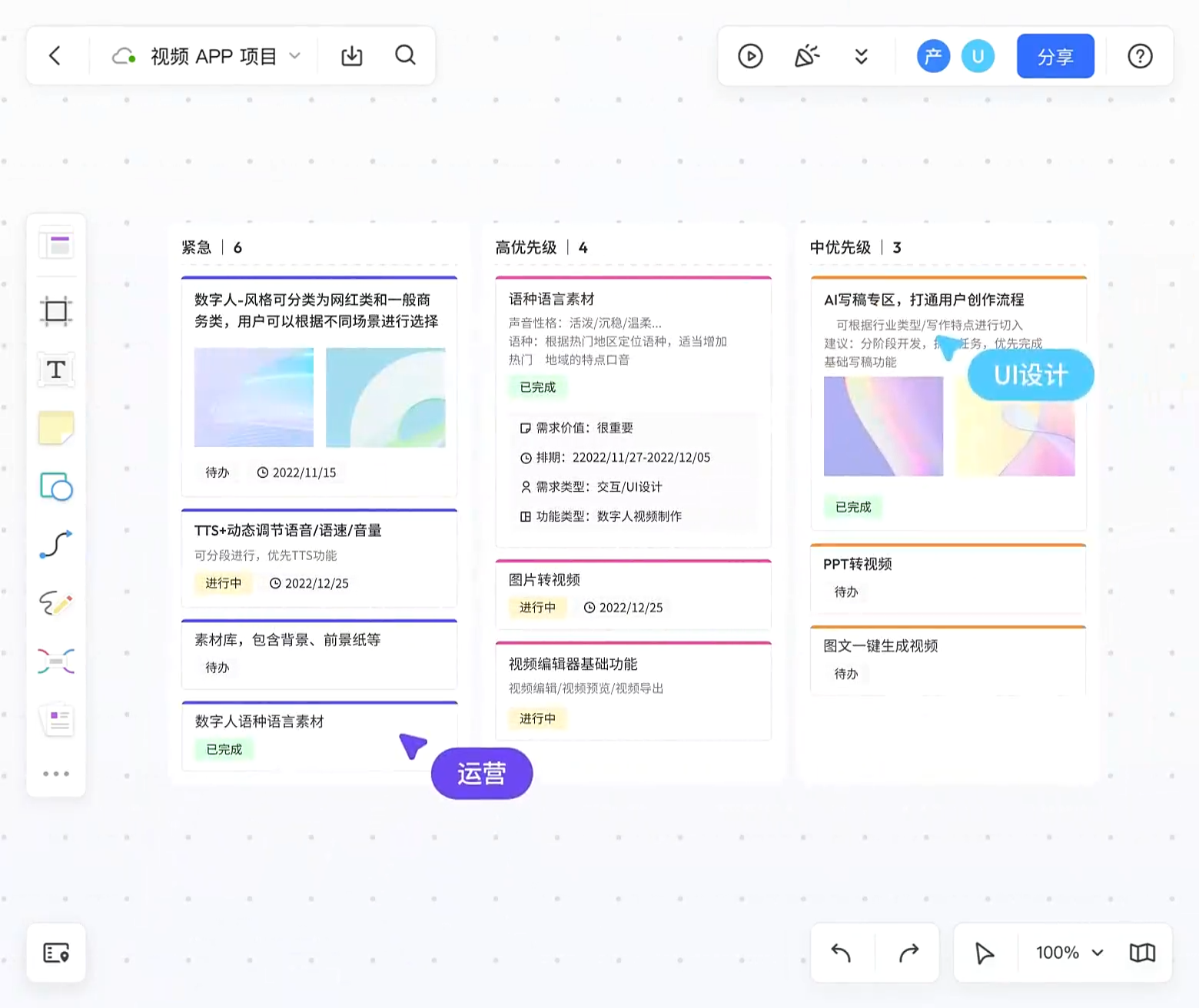 创意团队和团队管理者: 创意团队可以使用在线白板快速脑暴并把想法变成可视化概念。而团队管理者则能借助链接交付功能更高效地管理团队工作流程。