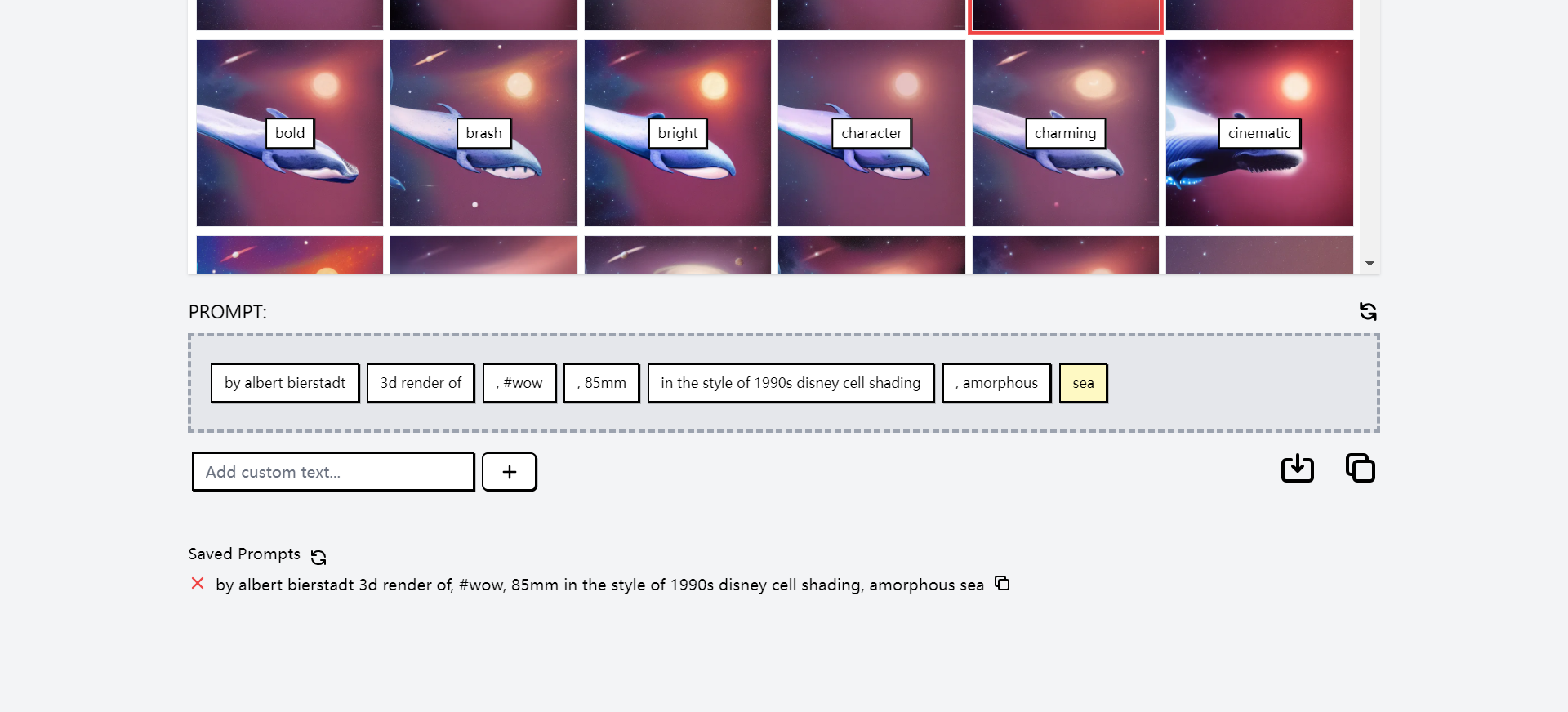 使用 Visual Prompt Builder 极为简单,只需浏览艺术家和风格的列表,选择您喜欢的组合,然后输入一个简短的提示。这个提示可以是一个词、一个短语或一个完整的句子,将成为生成艺术和文案的灵感源泉。