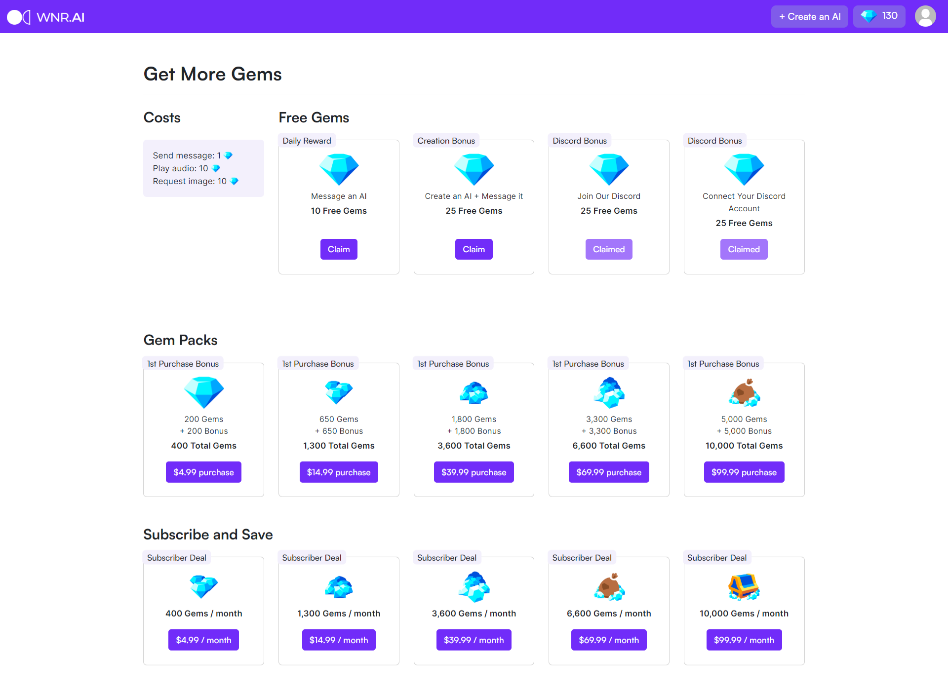 WNR.AI 为用户提供了免费使用的基本功能,同时还设有宝石解锁的高级功能。新用户初始账户即赠送80宝石,并可通过完成每日任务、创造任务等获得额外宝石奖励。为了更灵活地享受平台的优越功能,用户还可选择通过充值获取更多宝石。