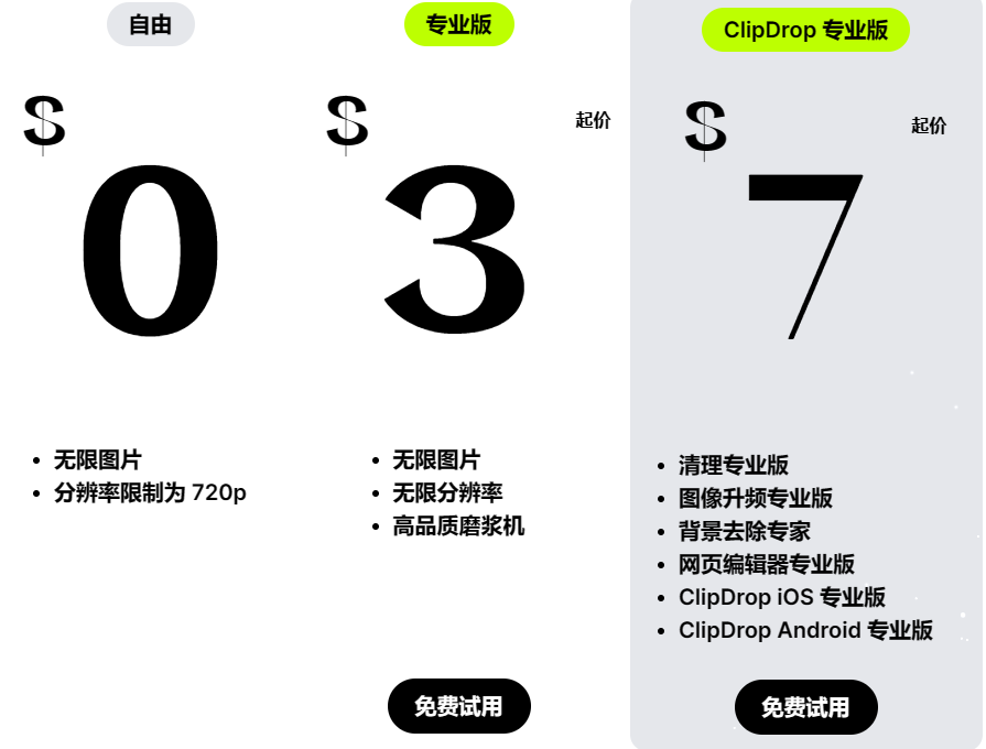 Cleanup.pictures设置了多档定价,分为免费版、专业版、ClipDrop 专业版