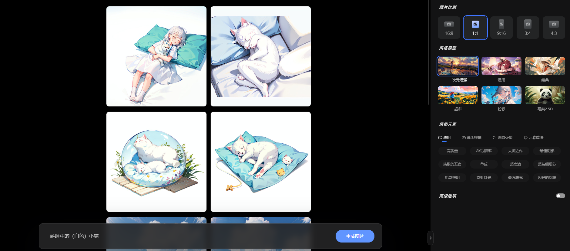3.然后我们还需要根据自己的需求选择图片风格和图片比例,比如我们选择二次元风格和16:9的比例,设置完成后点击开始创作按钮,之后便会生成我们想要的画作。