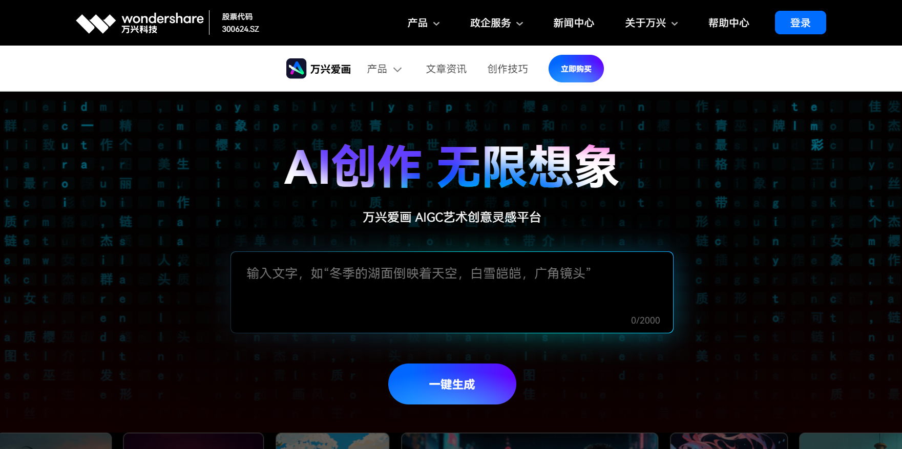 万兴爱画是万兴科技的产品之一,利用AI将想法生成图片,是一个AIGC艺术创意灵感平台。只需要输入几个描述性的关键词,万兴AI就会自动处理代码、绘图、建模等任务,以十分之一的成本、百倍千倍的生产速度,创造出有独特价值和独立视角的内容。