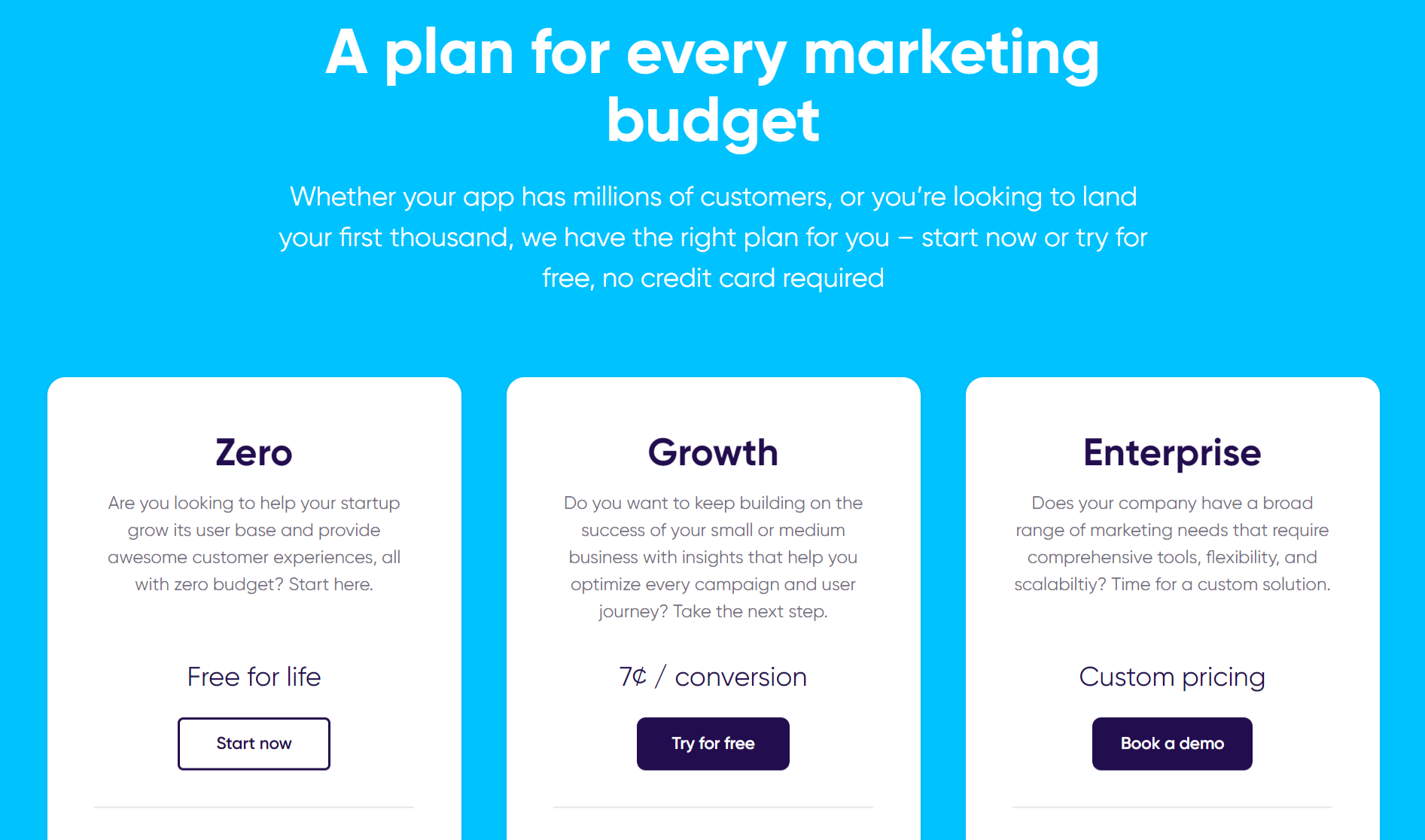 AppsFlyer 提供多种定价计划,根据不同的营销预算和需求,为各类应用提供了适合的方案。他们的 Zero 计划是免费的,适合初创企业,提供 12,000 次转化,以及一系列核心营销分析工具和 SkadNetwork 支持等功能。成长计划是在 Zero 计划的基础上提供更多功能,包括移动归因、多点归因、iOS 14.5+的全面测量、网络至应用的高级归因等,每次转化费用为 7 美分。企业计划则为大型企业提供定制化解决方案,拥有更丰富的功能,包括跨平台归因、网络归因、电视 /OTT 归因、深度链接 API 等,并提供了更全面的支持和培训服务。无论您的应用规模如何,AppsFlyer 都提供了多种选择,让您根据实际需求灵活选择合适的定价方案。