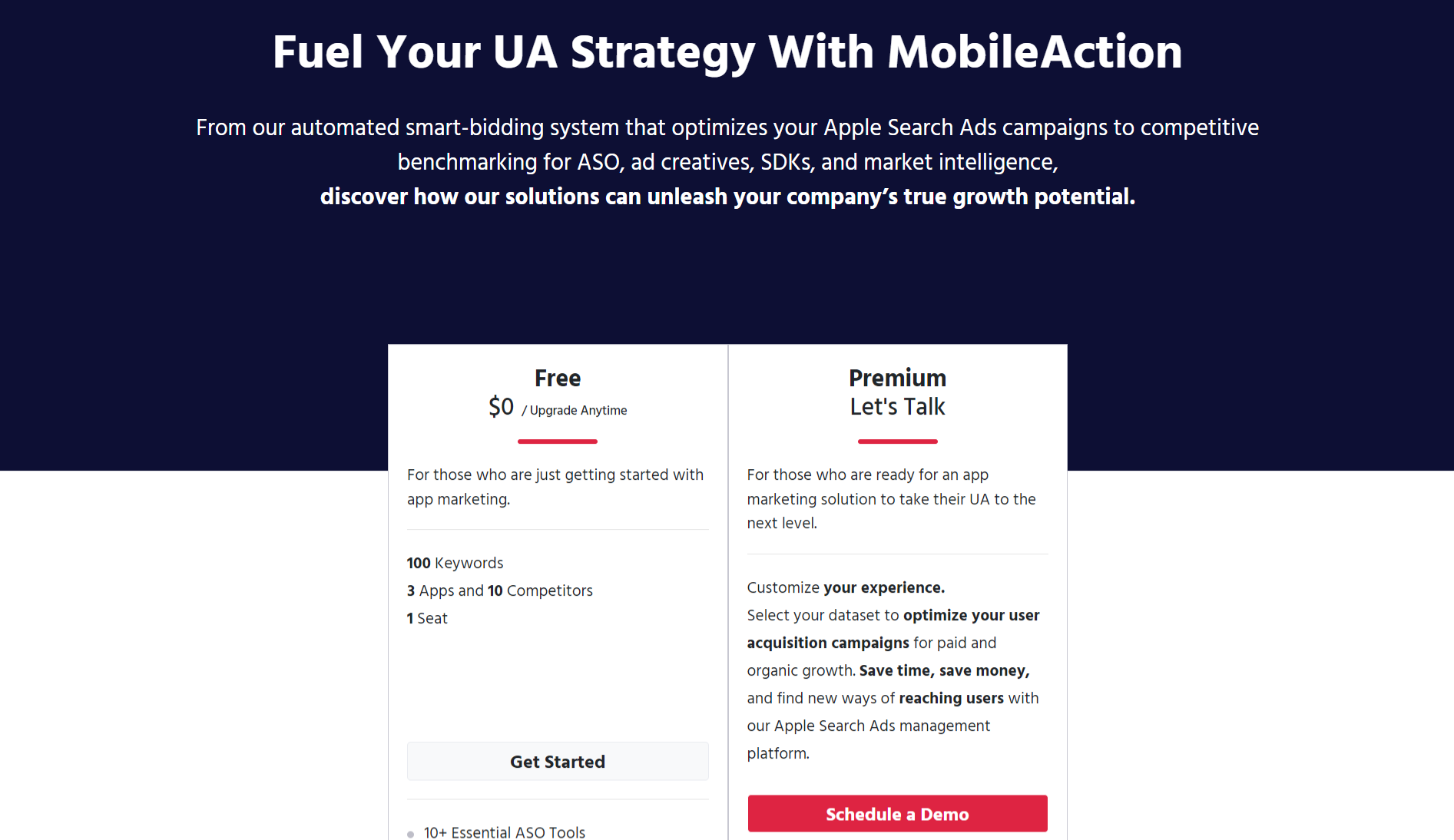 MobileAction 提供两种定价计划。其免费版适合刚开始进行应用营销的用户,包括监控关键词、竞争对手、基本 ASO 工具和应用商店洞察等功能。而高级版则为准备提升用户获取策略的用户提供了更全面的解决方案,包括更多定制化选项、数据集选择和广泛的市场情报、ASO 情报等工具。这两种计划各有侧重,能够满足不同用户的需求。
